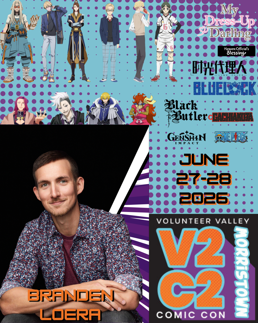 Branden Loera is a Hispanic, classically trained actor/director from Hardin-Simmons University (Musical Theatre/Opera). Currently, he's best known for his VO roles in Gachiakuta (August Stilza), Heaven Official's Blessing (Lang Qianqiu), Link Click (Xia Fei/Felix), Black Butler (Cheslock), My Dress Up Darling (Shiki Kashiwagi), Bluelock (Itsuki Wakatsuki), Tying The Knot With An Amagami Sister (Uryu), and One Piece (Kazekage).